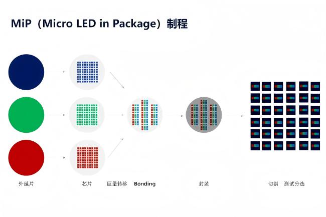 MiP(Micro LED-in-Package)是一种芯片级封装技术,通过巨量转移技术将剥离衬底的 Micro LED 三色发光芯片固定在载板上,经封装、切割、检测及混光后形成独立器件。其核心创新在于融合 “Micro LED 芯片高性能” 与 “Mini LED 成熟工艺”,实现 “Micro 芯片 + Mini 封装” 的跨代兼容,显著降低传统显示技术的工艺难度与成本。