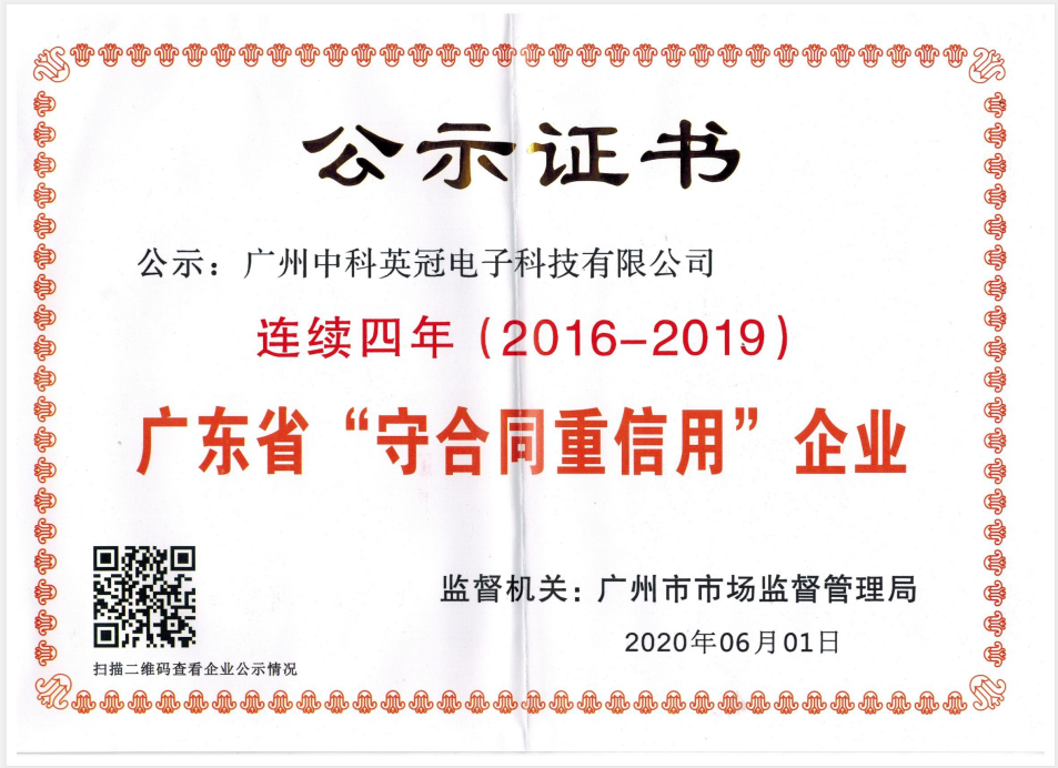 - 祝贺广州中科英冠电子科技有限公司连续四年(2016-2019)获得 广东省“守合同重信用”企业2020/11/24 12:03:17