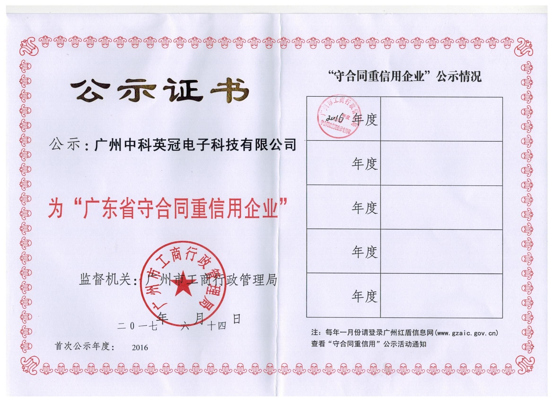 - 热烈祝贺广州中科英冠电子科技有限公司获得2016年度广东省守合同重信用企业。2017/7/25 15:00:56
